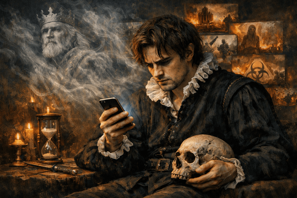 Not all of it is manipulation; much of it is real. But the delivery system is built for compulsion, even addiction. It produces something resembling Hamlet’s state of agitation: the sense that we must stay alert, must keep watching, must keep scrolling, even as our capacity to think and act steadily is eroded.